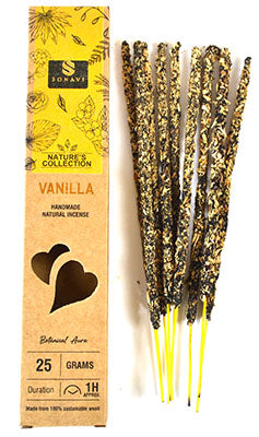 Sonavi presents its handmade natural incense featuring a harmonious scent of vanilla from the nature's collection line.These eco-friendly, non-toxic, and cruelty-free incense sticks are crafted with care, ensuring a pure and aromatic experience.25-gram pack with each stick designed to burn for approximately one hour, allowing for extended enjoyment of their soothing fragrances.Proudly made in india, this incense is perfect for enhancing relaxation and creating a serene atmosphere in any space.